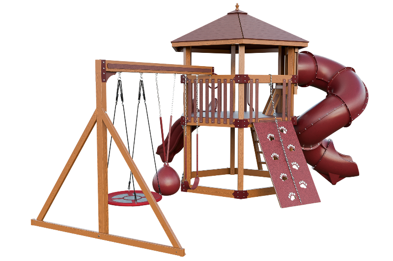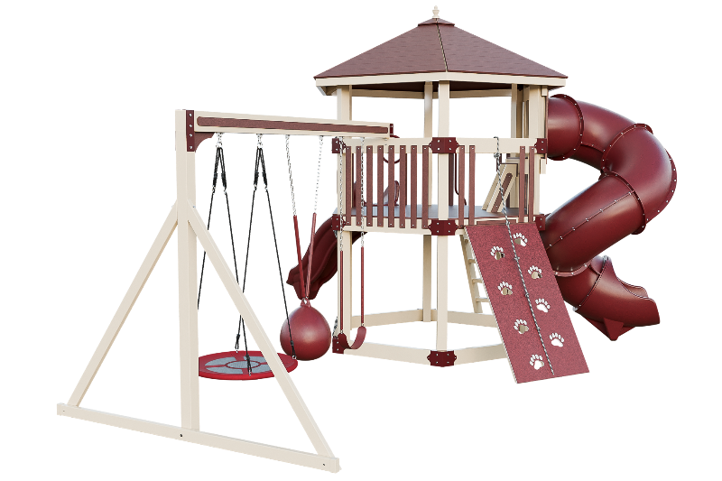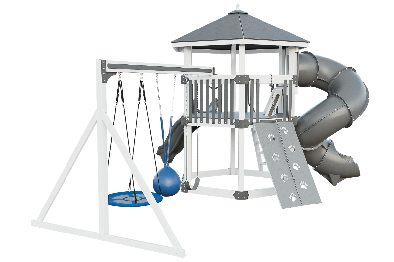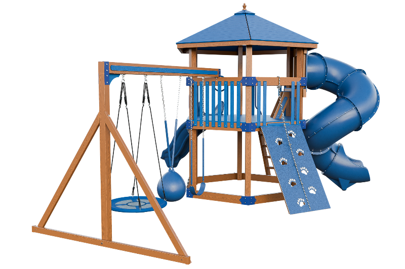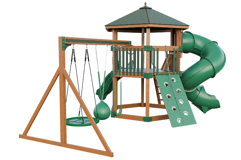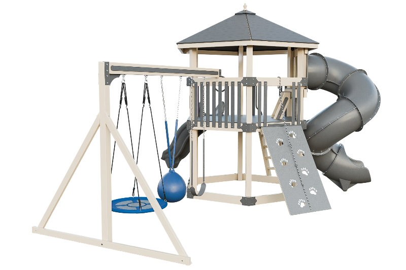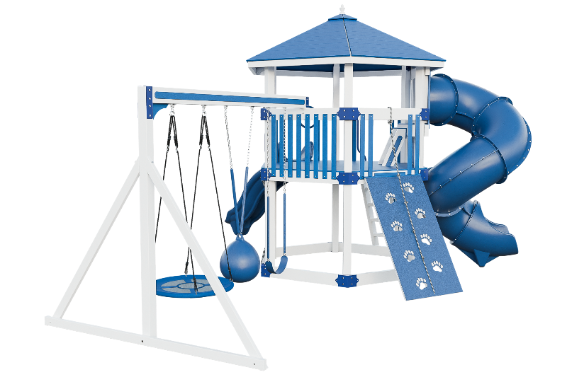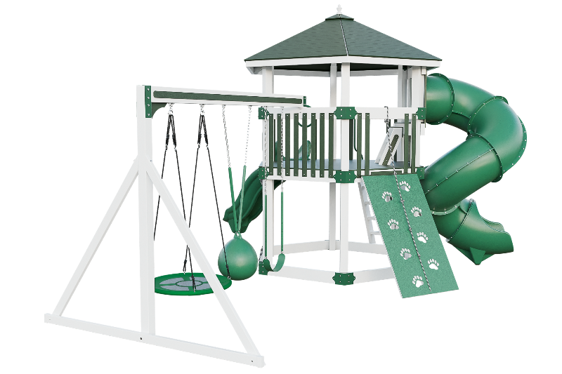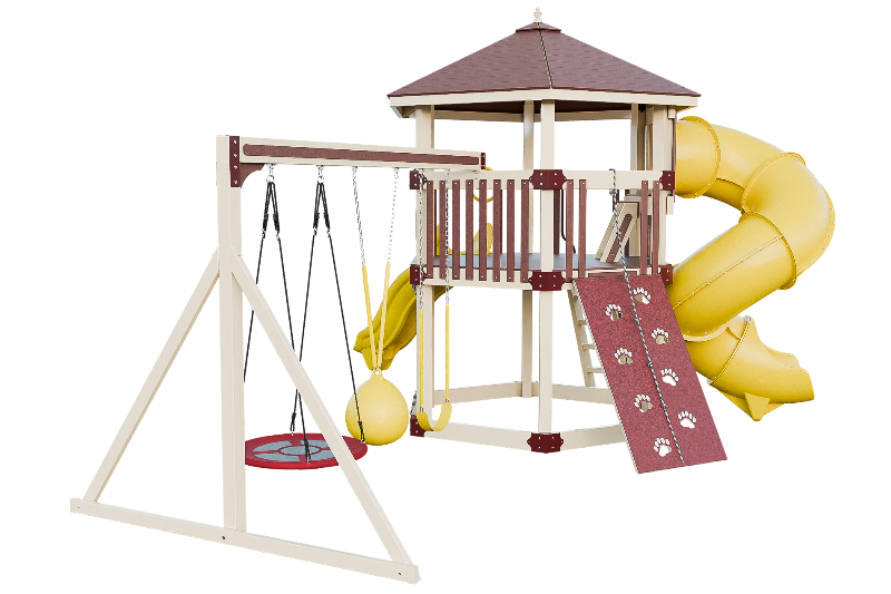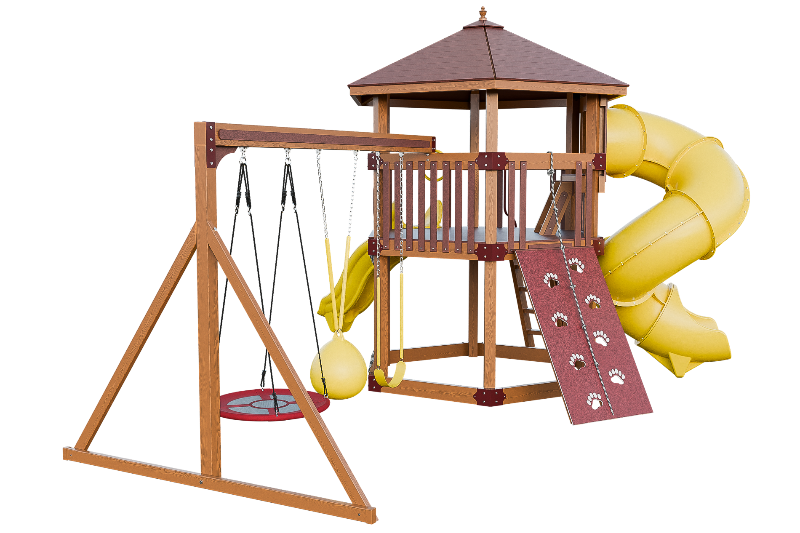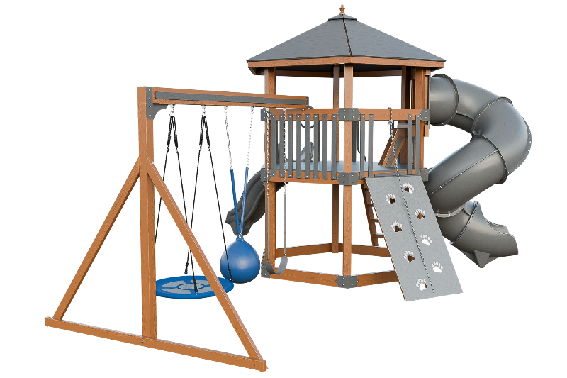 This hexagon tower playset is a spectacular addition to any backyard. It features a bear paw climber wall that leads to a spacious 5ft deck, where kids can enjoy the view and plan their next adventure. They can choose to slide down the thrilling 7ft turbo twister slide or the exciting 10ft Avalanche slide, both of which are designed for safety and fun. The playset also has a three-position swing beam that offers different options for swinging, such as a belt swing, a buoy ball, or a web swing. This playset is perfect for kids who love to climb, slide, and swing, and it will provide them with hours of outdoor entertainment.
