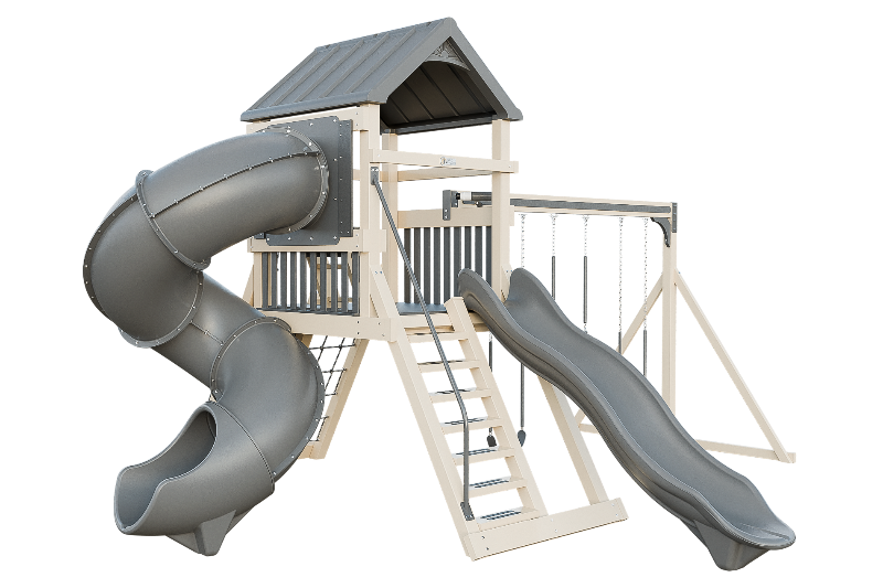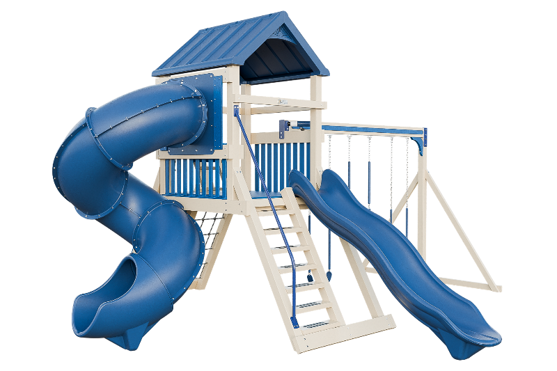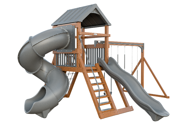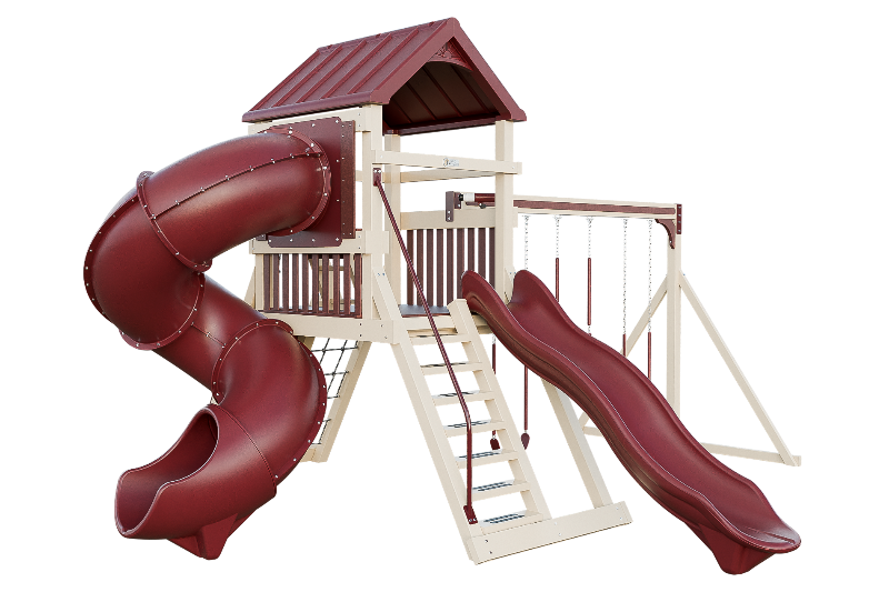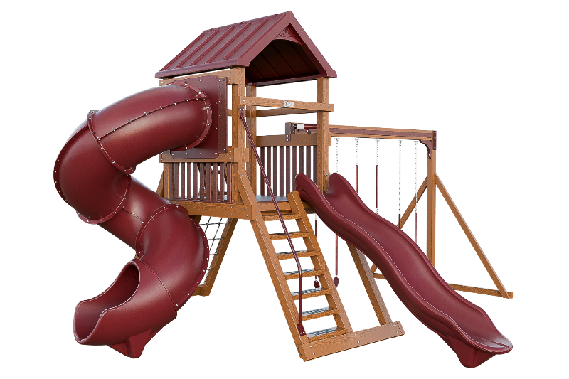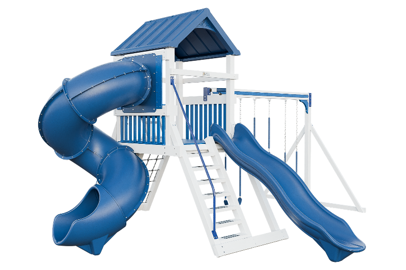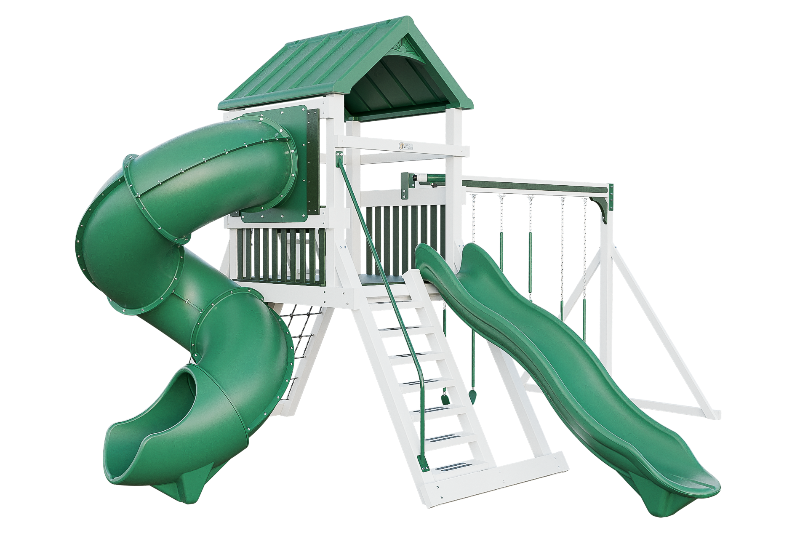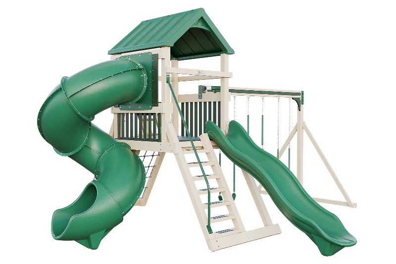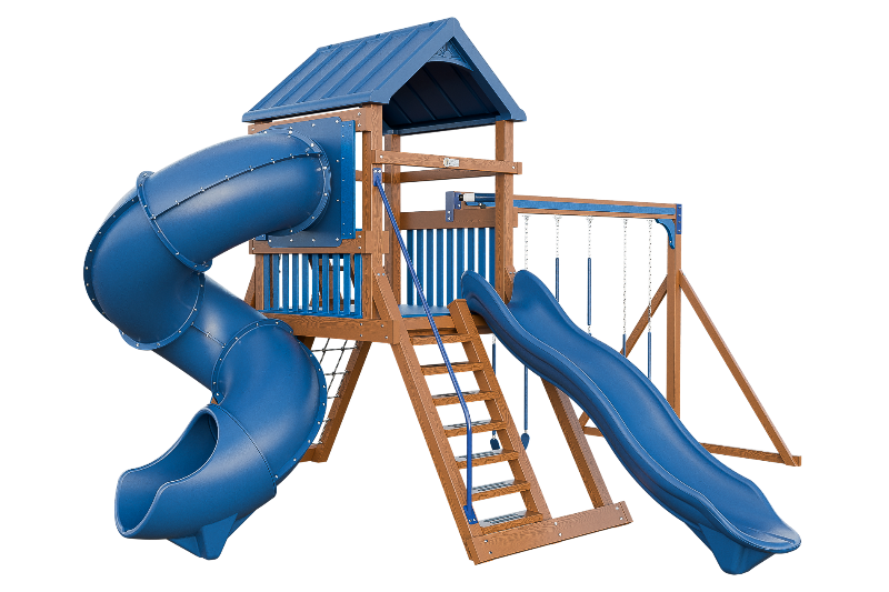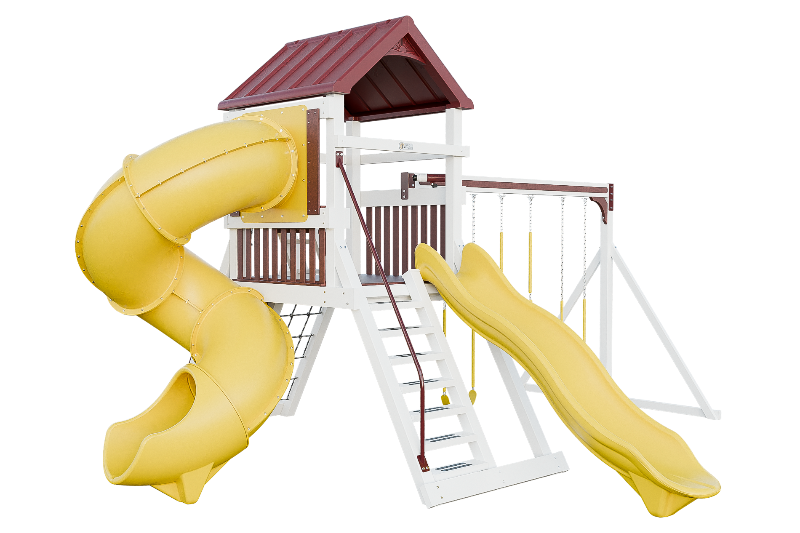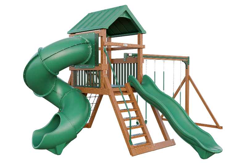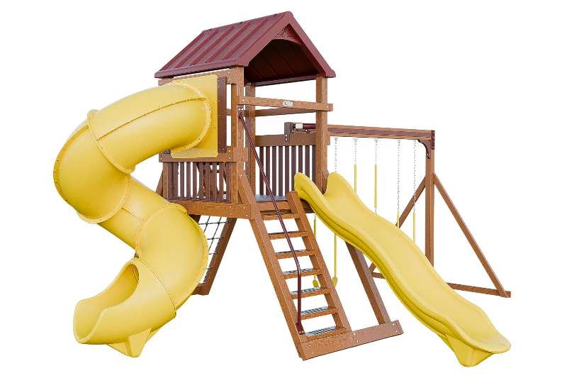 Introducing the Climber 55 Turbo Deluxe playset, the ultimate outdoor adventure for kids of all ages. This playset features a variety of activities to challenge and entertain your children, such as a rock wall, a cargo net, a monster 7ft turbo twister slide, a 10 ft Avalanche slide, a tire swing, and three more swing options. These playsets are designed to be durable, and safe. They are made of premium vinyl and wood materials and heavy-duty hardware that can withstand any weather condition. This playset is also customizable, so you can add or remove components as you wish.