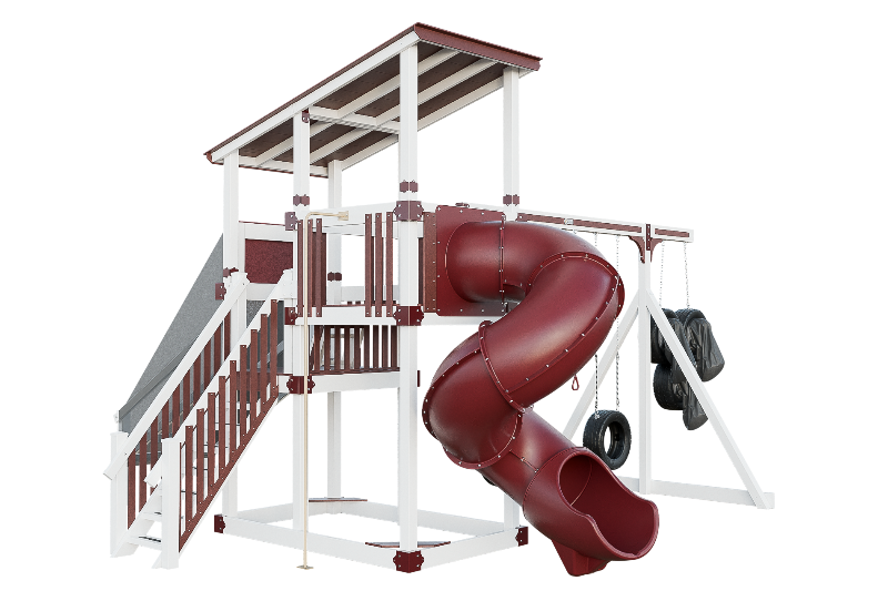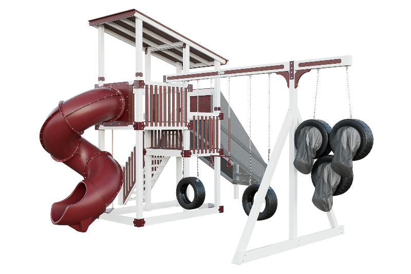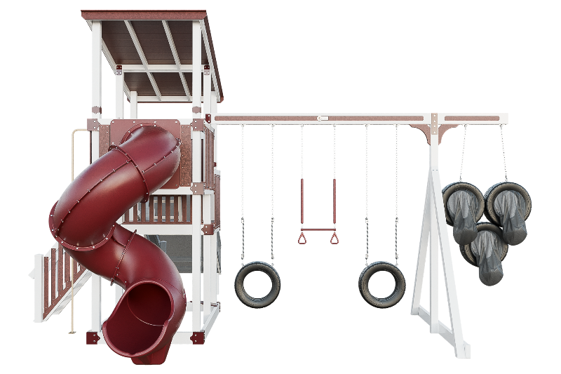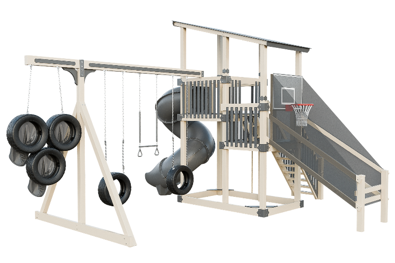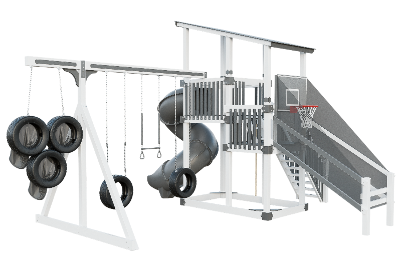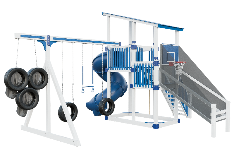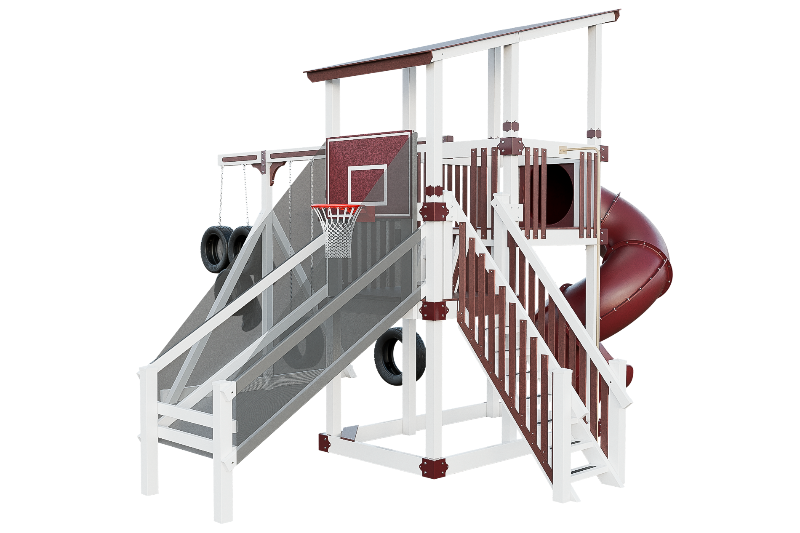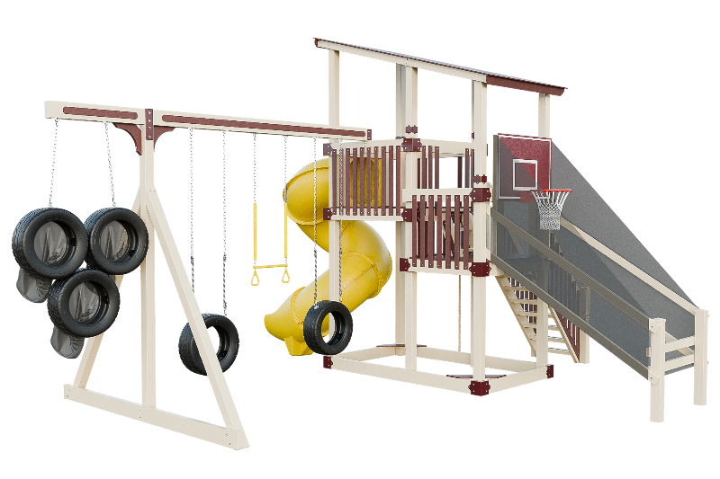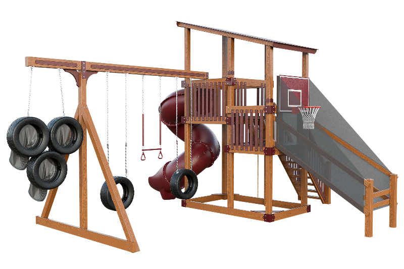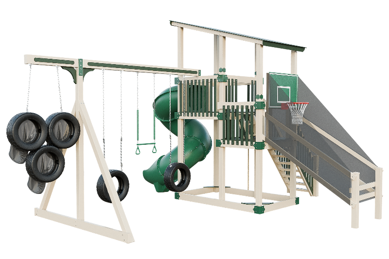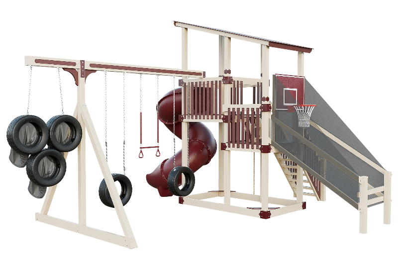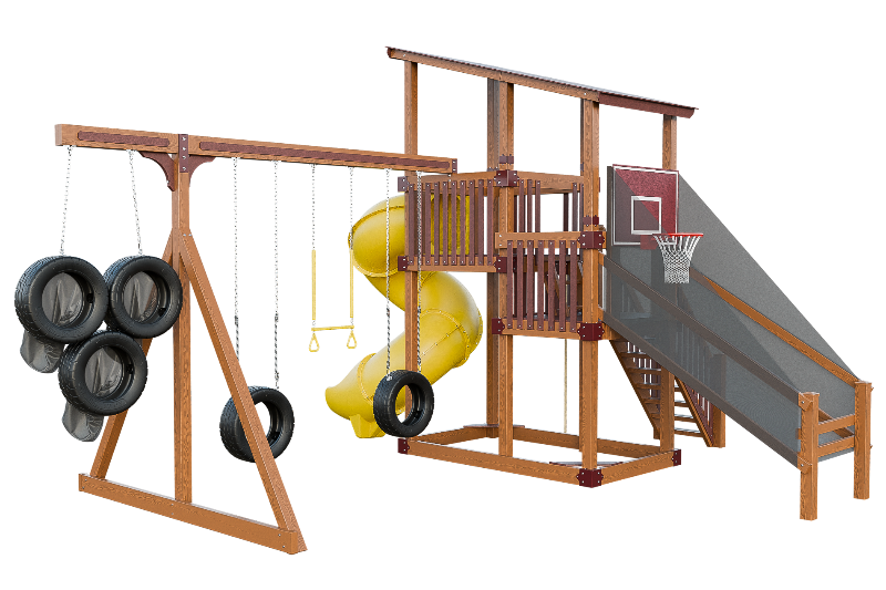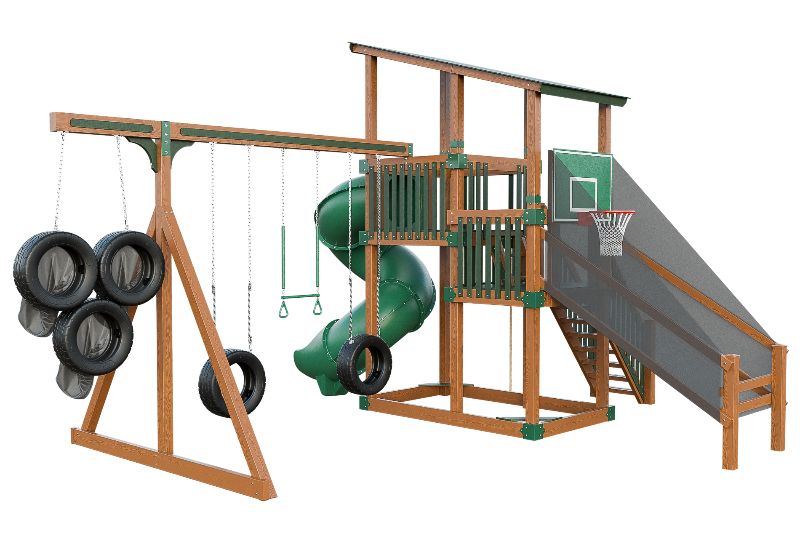 This playset is an adrenaline-fueled paradise for aspiring athletes. The quarterback challenge tests accuracy and precision, while the basketball hoops ignites competitive spirits. Scaling the towering structure grants access to exhilarating slides, including the pulse-pounding 7-foot turbo twister that sends riders plummeting into a whirlwind of excitement. Tire swings provide a gentler aerial experience, while trapeze bars encourage gravity-defying feats. The 7-foot fire pole beckons aspiring firefighters to ascend and slide down with heroic flair, igniting imaginations, and forging unforgettable childhood memories.
