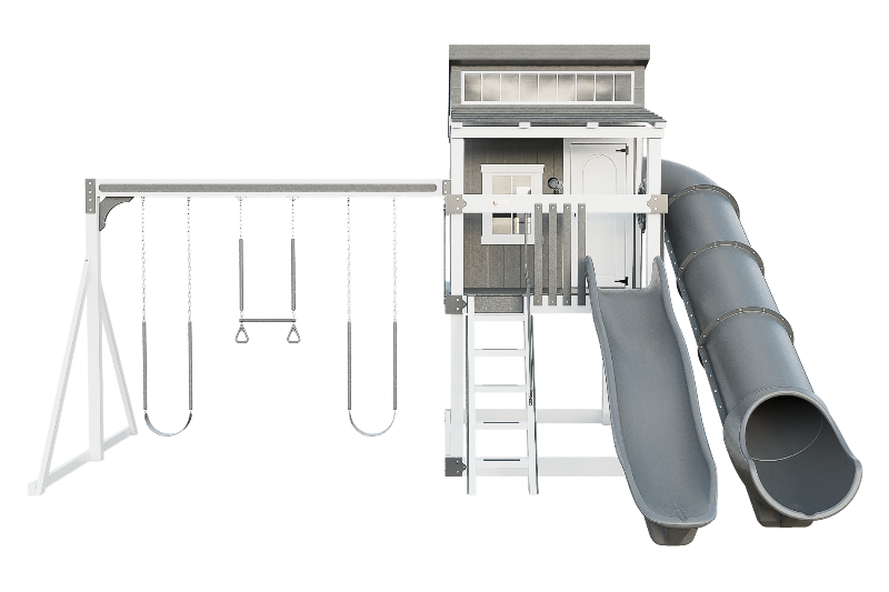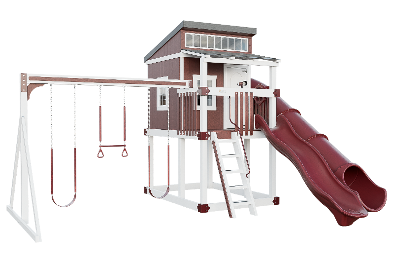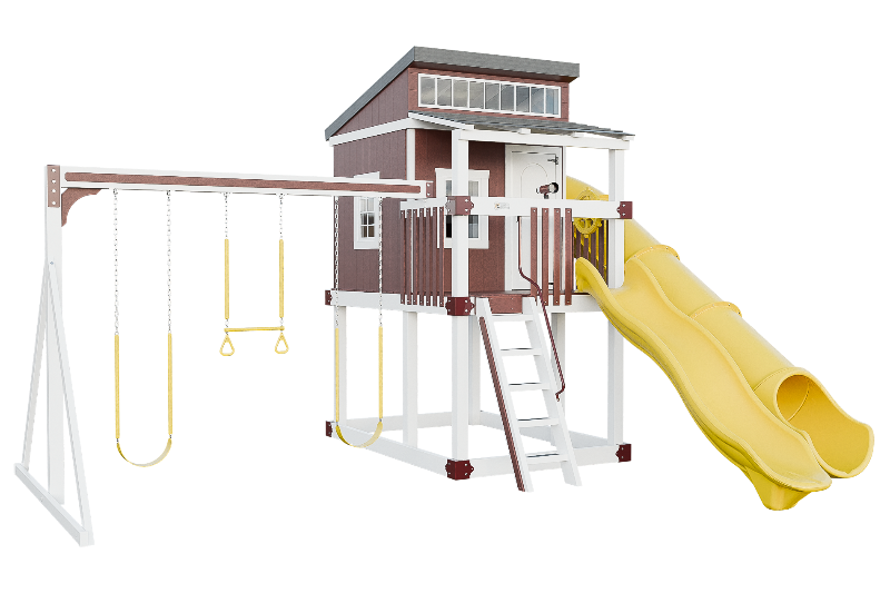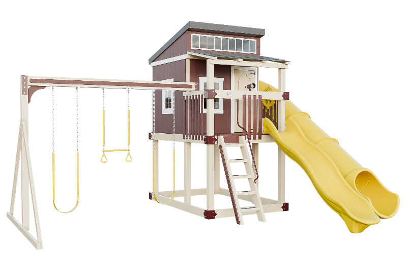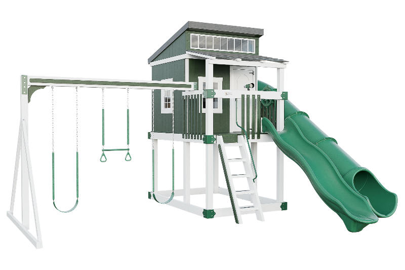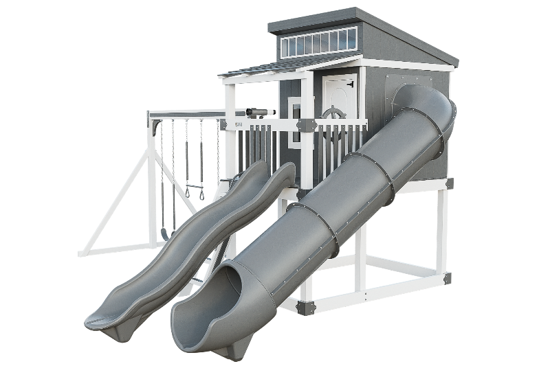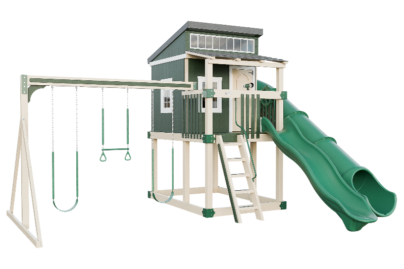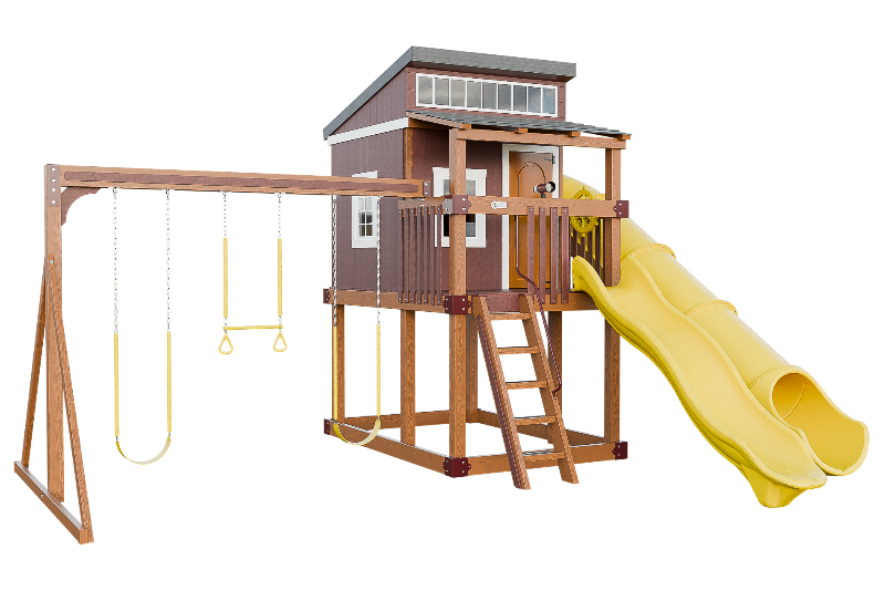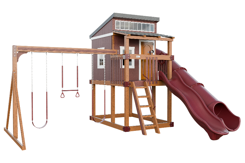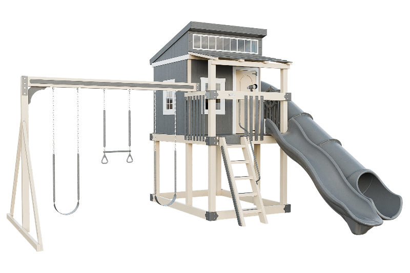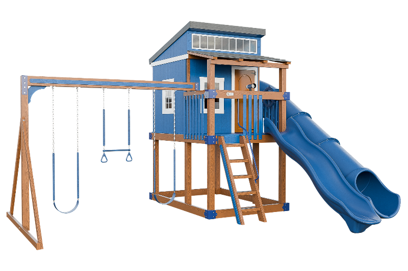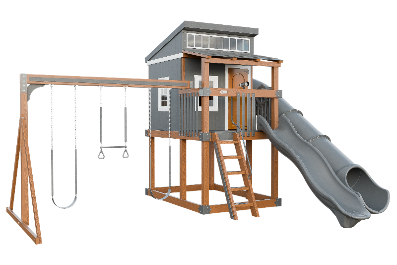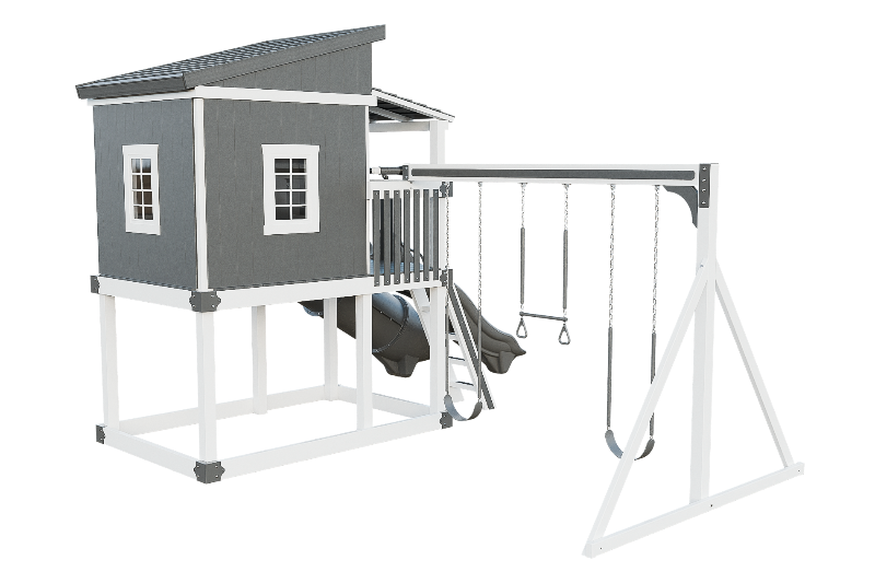 The Kingdom Lodge is a wonderful modern playhouse for kids. It has many windows that let in plenty of natural light. The kids can climb up the 5ft ladder with railing to reach the spacious porch, where they can choose to slide down the 10ft avalanche slide or enter the playhouse. Inside the playhouse, there is another slide, the 7ft Sidewinder, that adds more fun. The kids can also enjoy swinging on the 2 belt swings or the trapeze bar with rings. The Kingdom Lodge is a great way to encourage outdoor play and imagination.