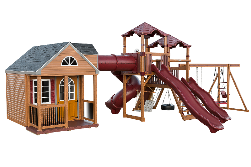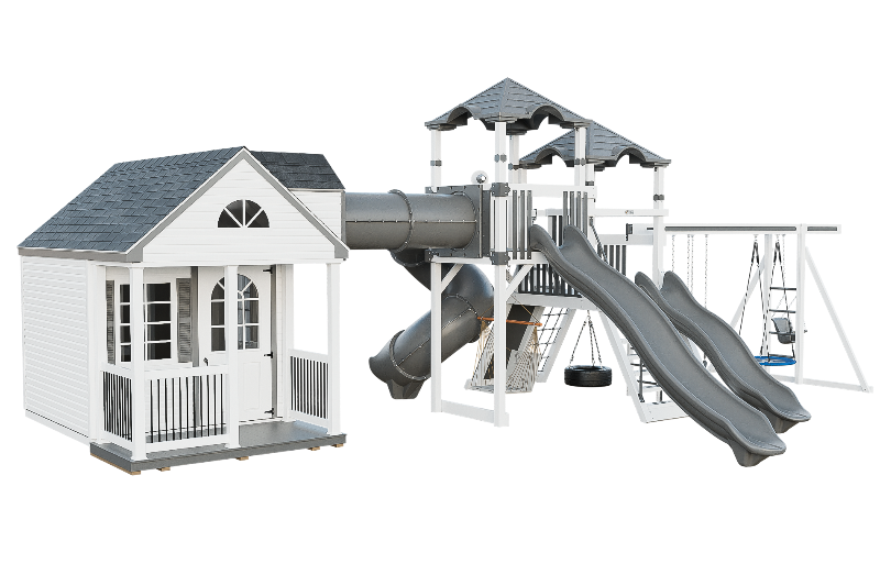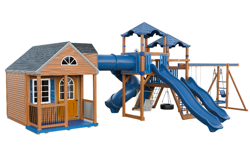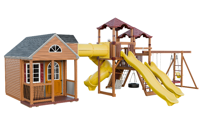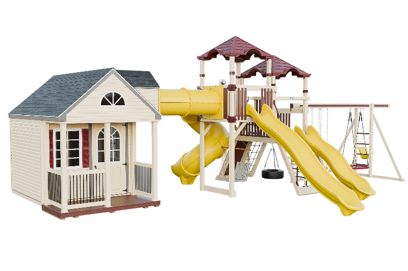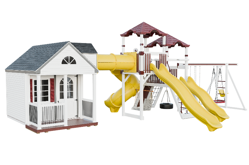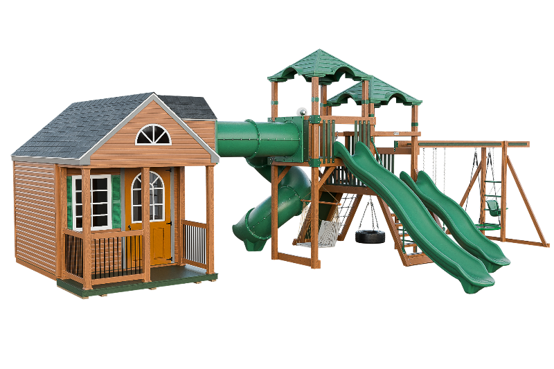 The Cottage Escape is the perfect playset and playhouse combo with endless customizable opportunities. You will love the spacious and cozy cottage that has real shingles and decorative shutters on the windows. The cottage has a second floor loft that you can access via a ladder, and from there you can go through a tunnel that connects to a fantastic play structure. The play structure has two towers that are full of fun activities. You can choose from the 14-foot or 10-foot avalanche slides, or the 7-foot turbo twister for a more exciting ride. You can also have fun on the swing beam, which has four positions and different swing options. The cottage escape is a perfect place to have a blast and create unforgettable memories with your family and friends.