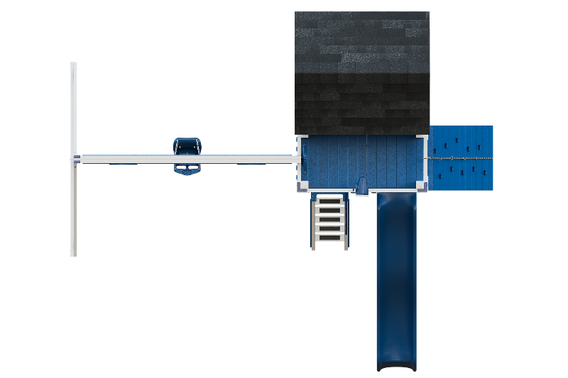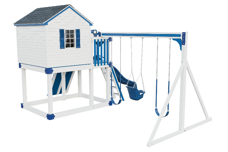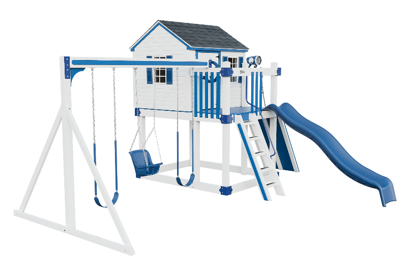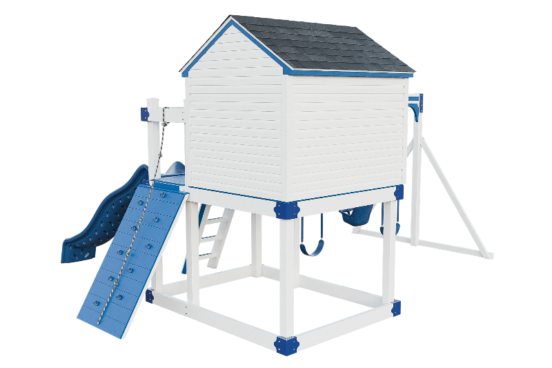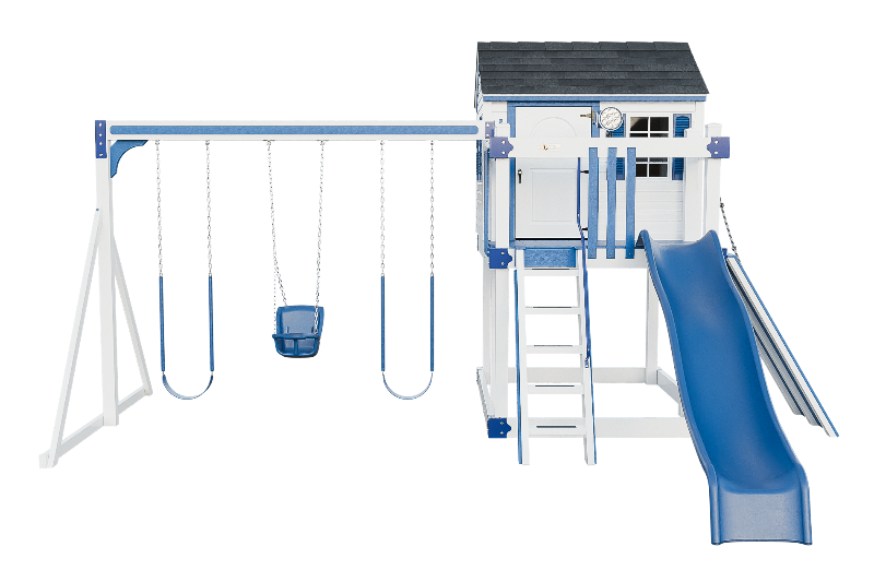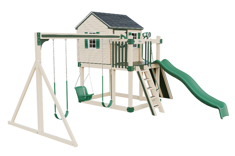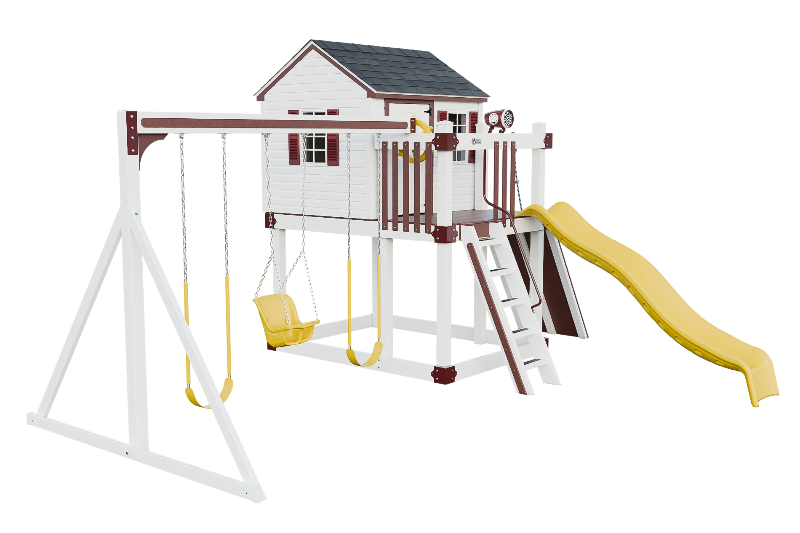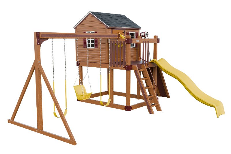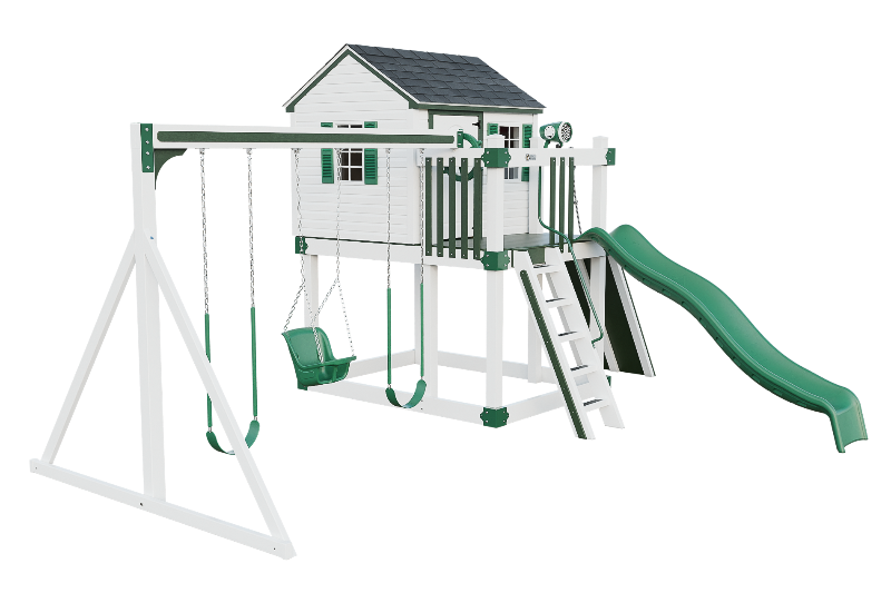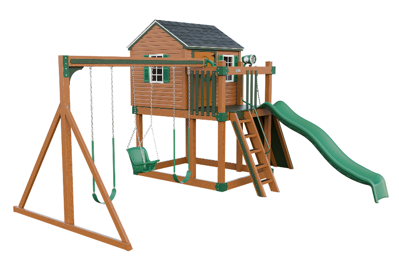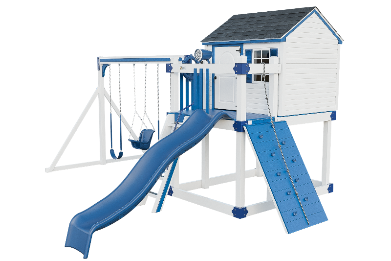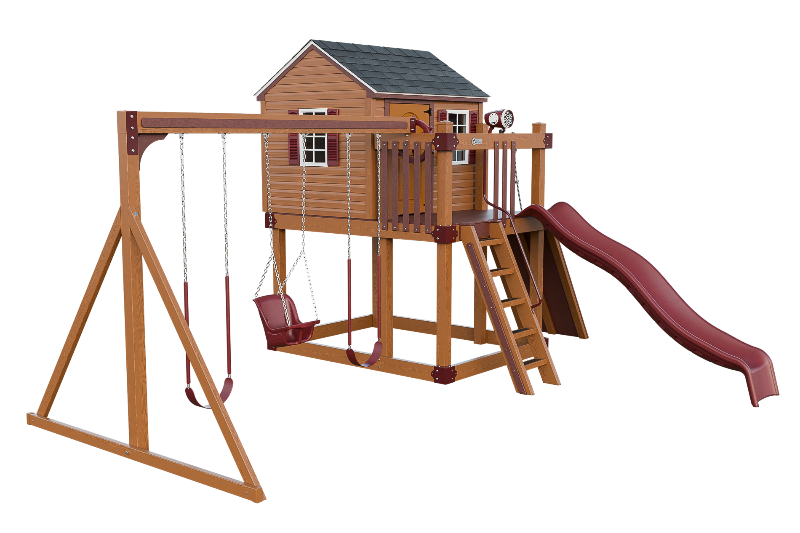 The Cabin in the playhouse series will spark creativity and fun. It has a dimension of 19ft x 17ft, which makes it ideal for smaller spaces. The playhouse is elevated on a 6ft x 8ft tower and has a shingled roof and windows with decorative shutters. The tower can be accessed by a 5ft ladder with rail or a rock wall that leads to the poly deck. The deck features a spotlight and a ships wheel for imaginative play. The playhouse also has a 10ft waterfall slide, two belt swings, and a baby swing for more enjoyment.