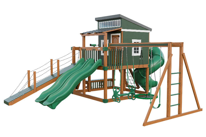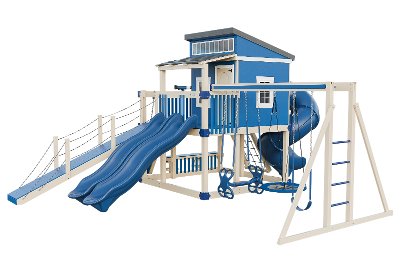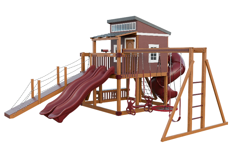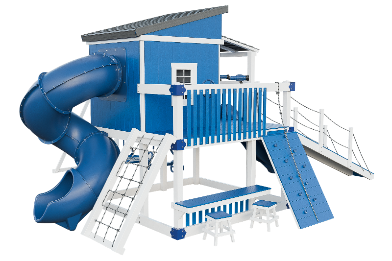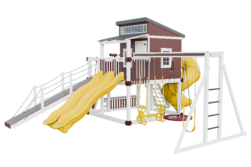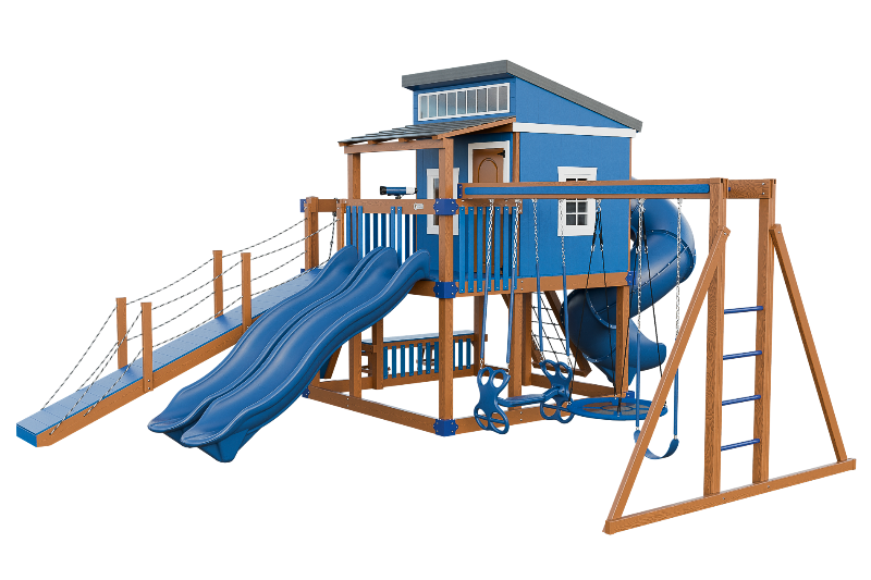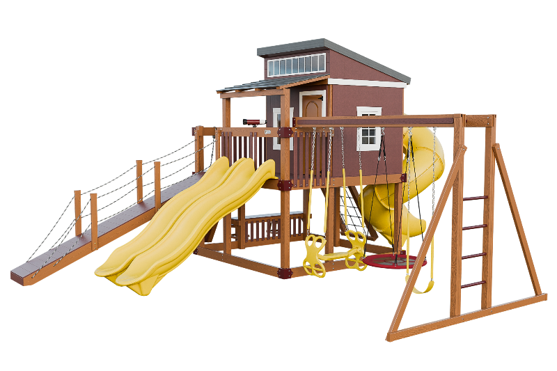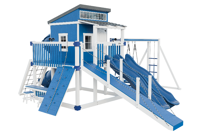 The Kingdom Lodge Deluxe is similar to our Kingdom Lodge however this version features a wrap around deck and twice as many features! You can reach the upper deck by using the 12ft ramp, the cargo net or the rock wall. There, you can enjoy the view or play with the steering wheel and telescope. You can also run your own business at the lemonade stand that comes with the playset. When you are ready for some fun, you can choose from three different slides: 2 10ft avalanche slide, or a 7ft turbo twister slide. The playset also includes a 3-position swing beam with a dual glider, a belt swing and a web swing for more excitement.
