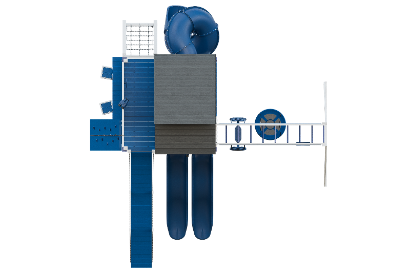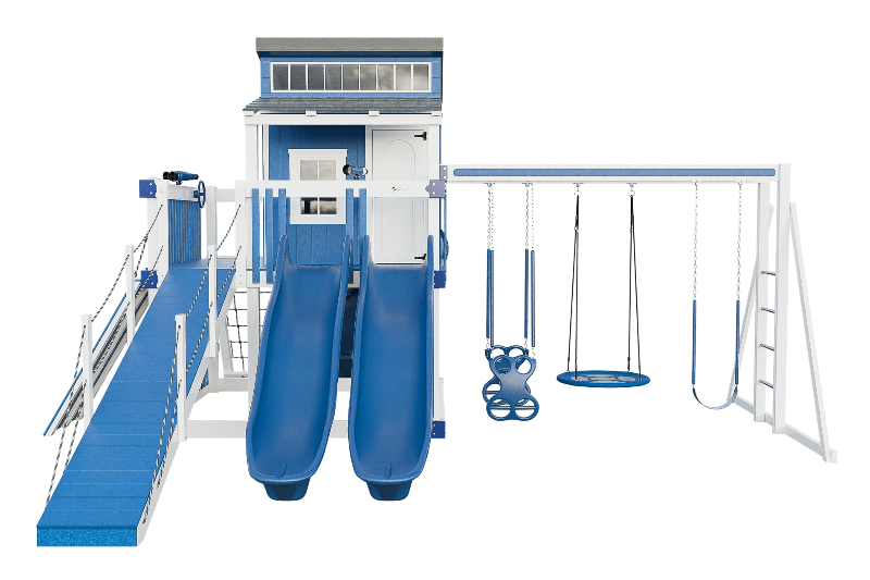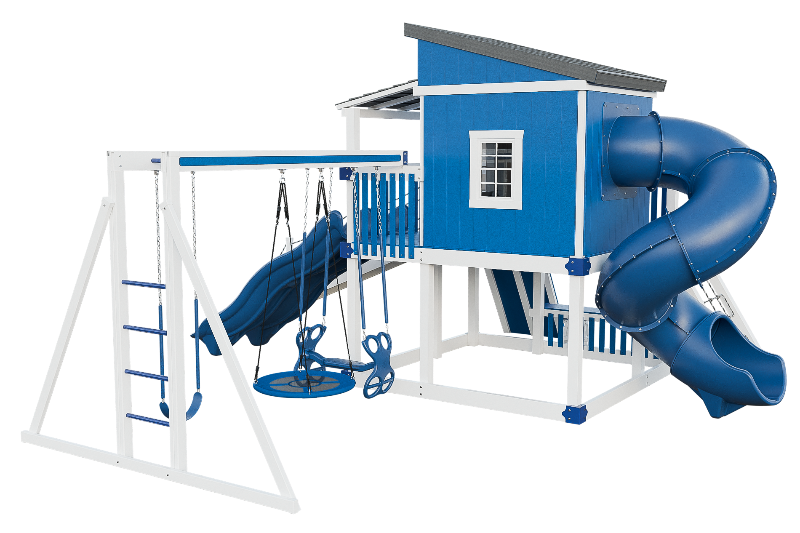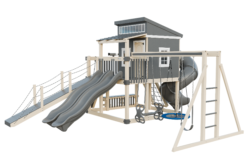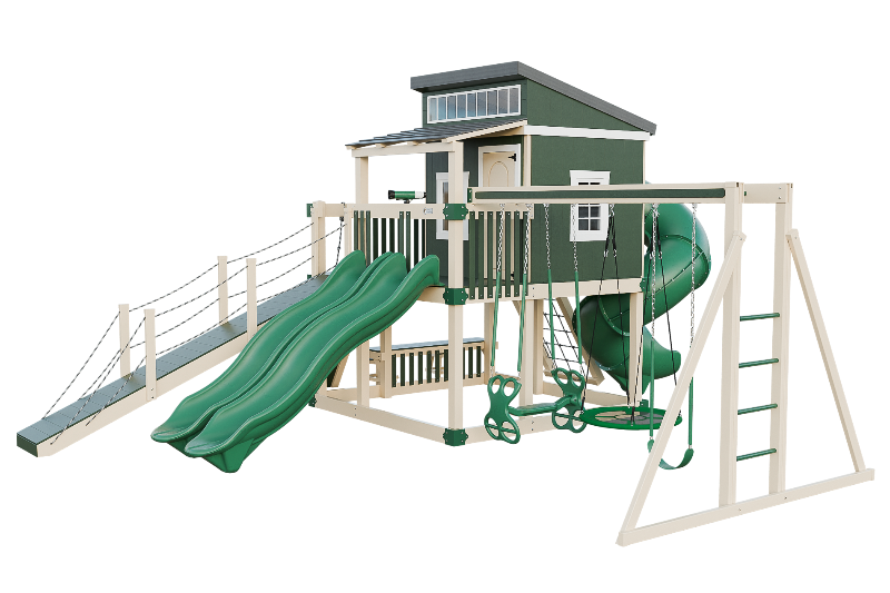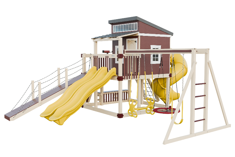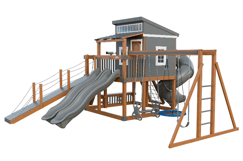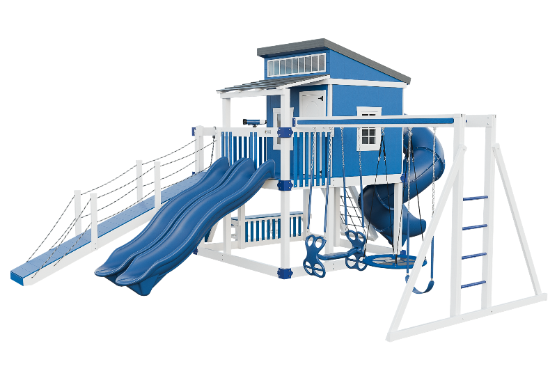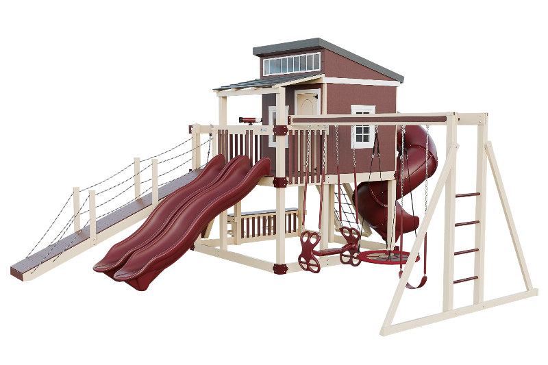 The Kingdom Lodge Deluxe is similar to our Kingdom Lodge however this version features a wrap around deck and twice as many features! You can reach the upper deck by using the 12ft ramp, the cargo net or the rock wall. There, you can enjoy the view or play with the steering wheel and telescope. You can also run your own business at the lemonade stand that comes with the playset. When you are ready for some fun, you can choose from three different slides: 2 10ft avalanche slide, or a 7ft turbo twister slide. The playset also includes a 3-position swing beam with a dual glider, a belt swing and a web swing for more excitement.