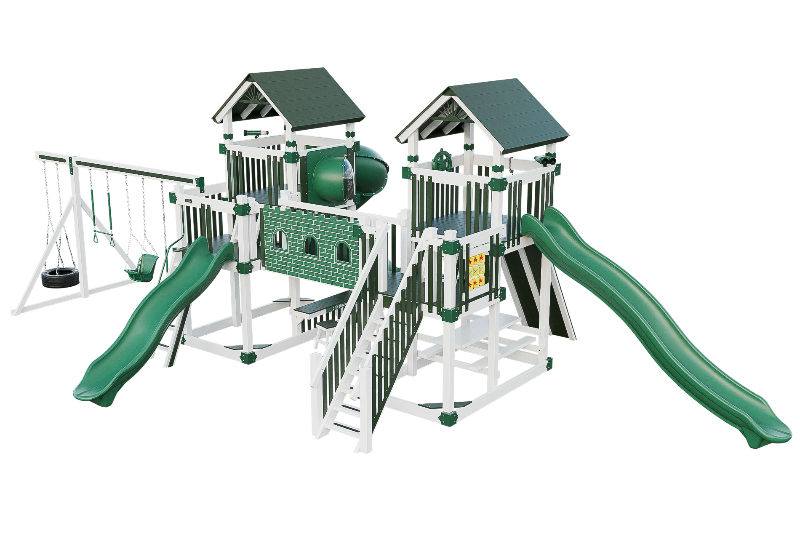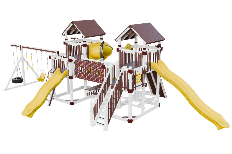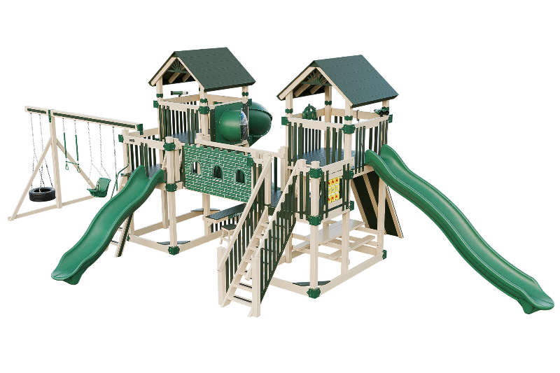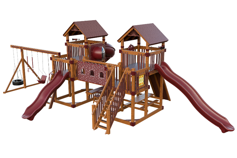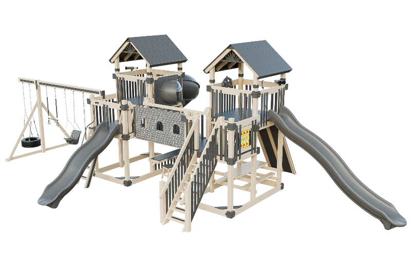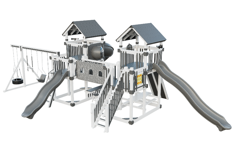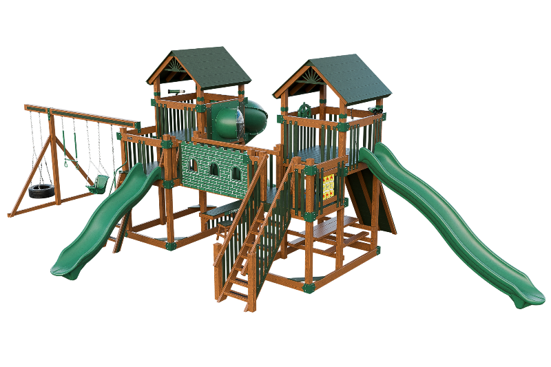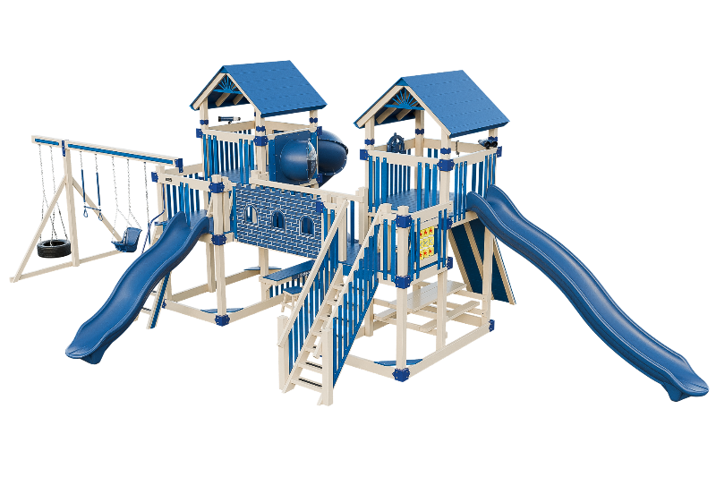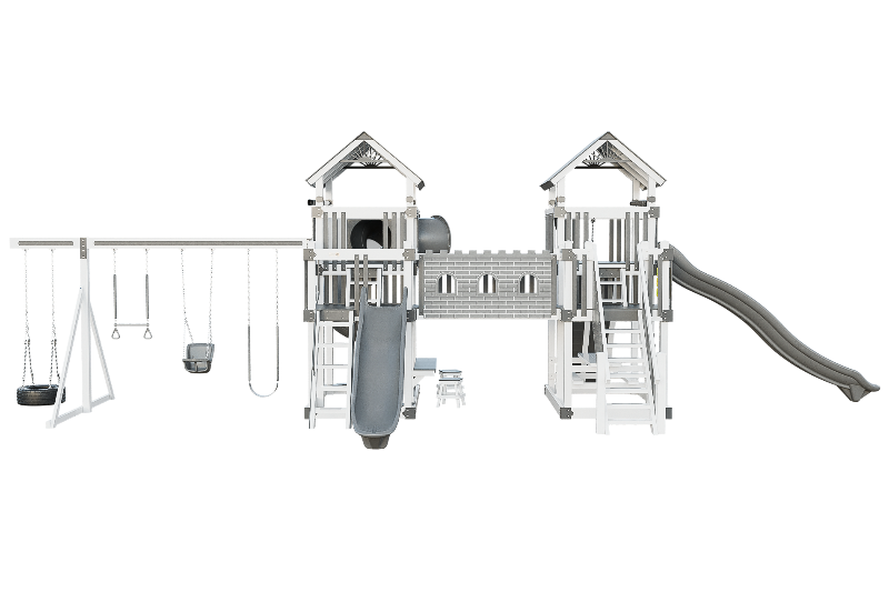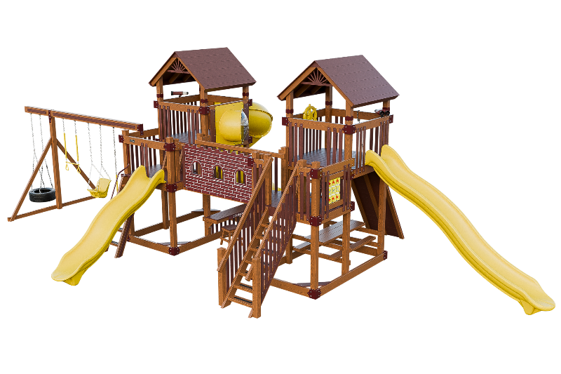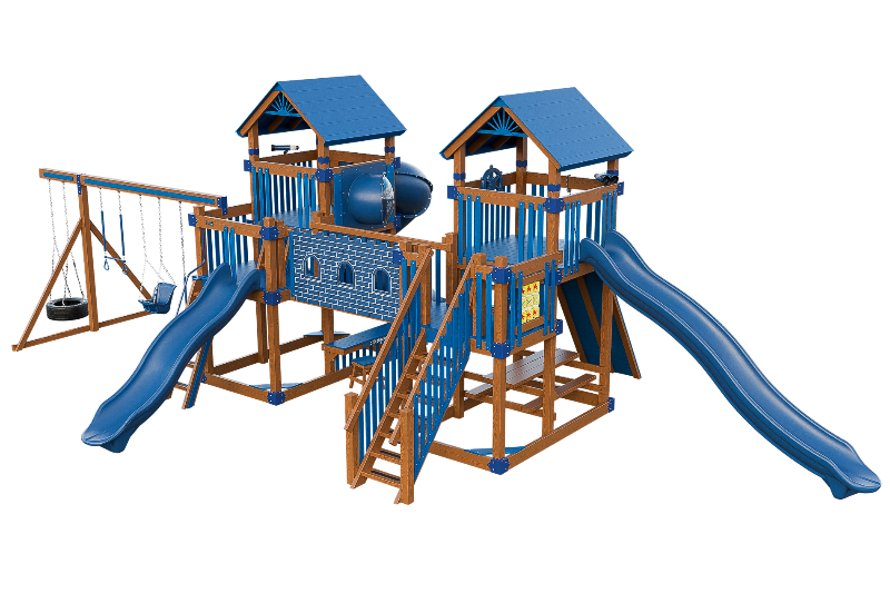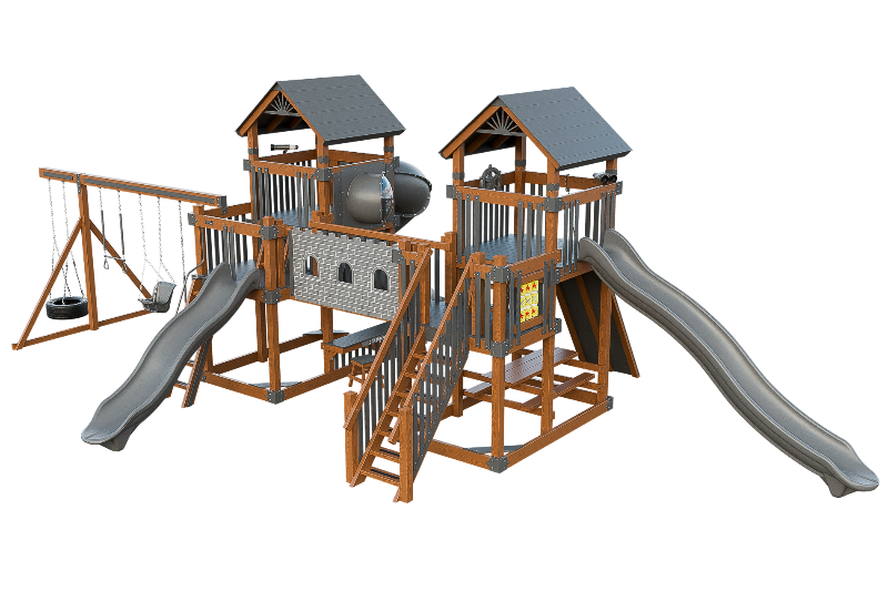 This Fortress playset is the ultimate castle play space. The playset features two flanking towers connected by a castle bridge. The towers can be accessed by three different methods: a staircase, a 5ft access ladder with railing, or a 7ft rock wall for more adventurous climbers. The playset also offers three slide options: a 14ft or 10ft Avalanche slide, or a 7ft turbo twister with transparent sections. Additionally, the playset includes various accessories such as binoculars, telescope, ships wheel, picnic table, castle wall and tic tac toe. This Fortress playset and swing set is designed to provide hours of fun and entertainment for children of different ages and abilities.