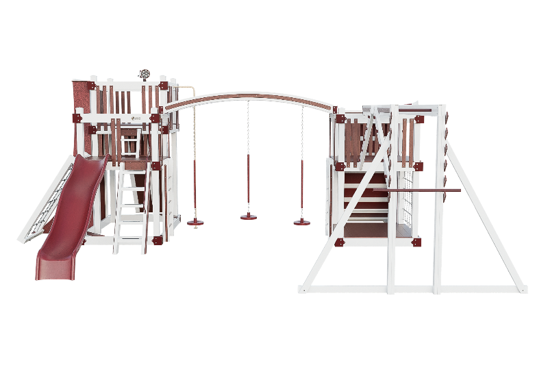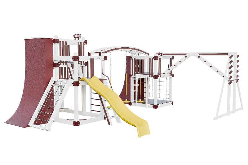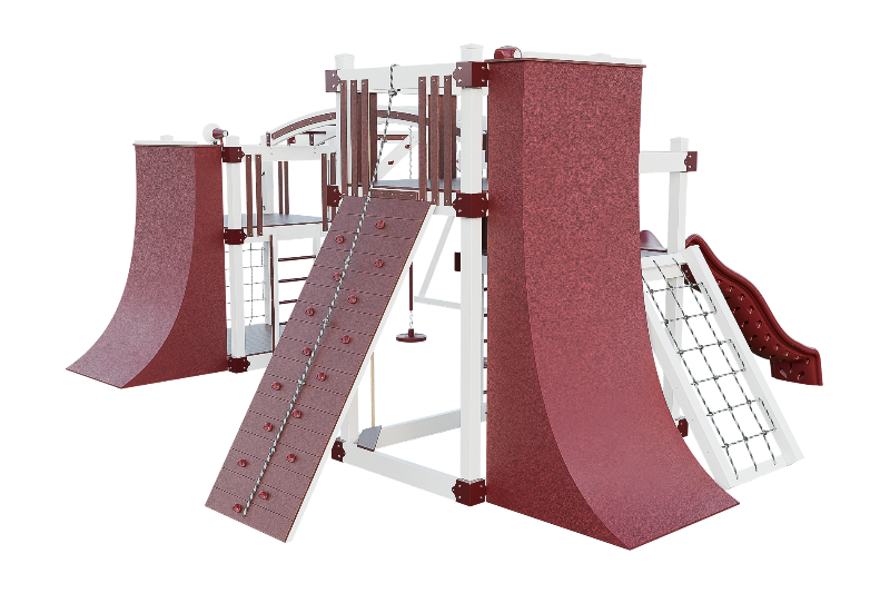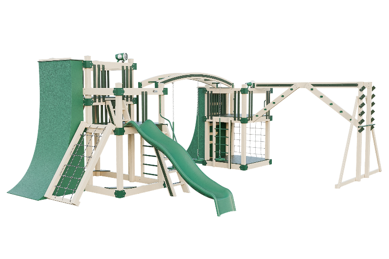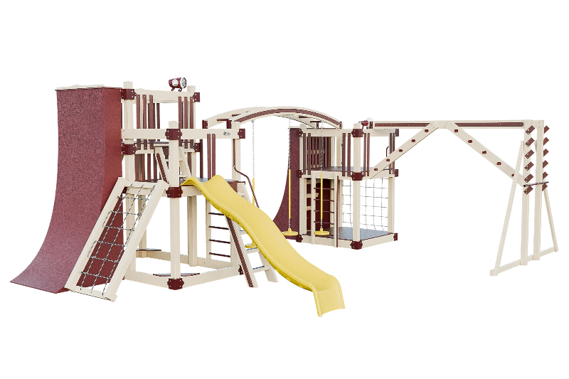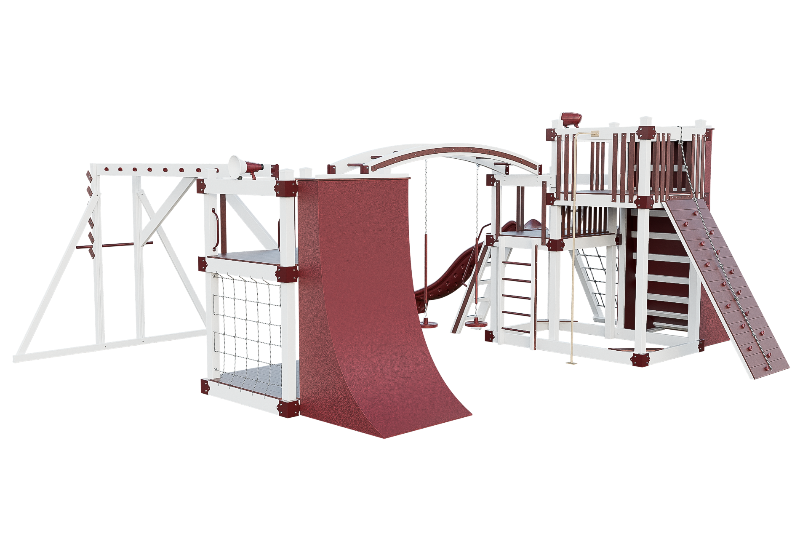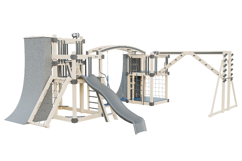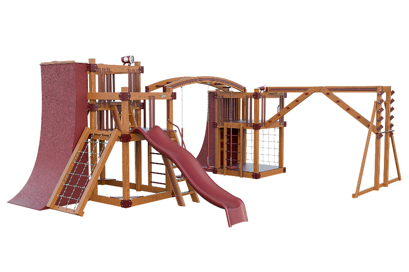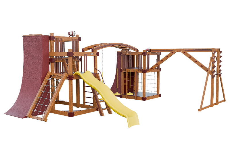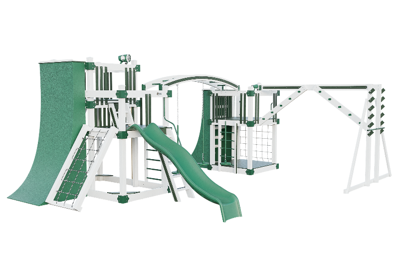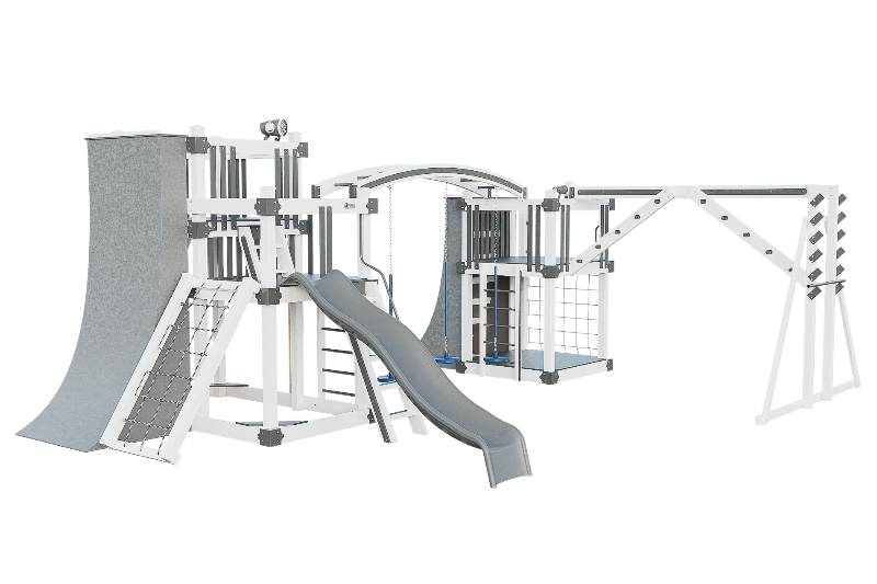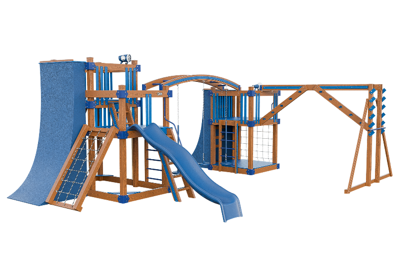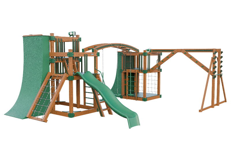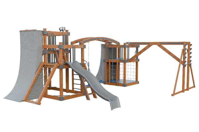 The Obstacle Course playset offers an ideal training ground for aspiring ninja warriors. It features multiple climbing options, including an access ladder with railing, tower mounting ladders, cargo nets, and a challenging rock wall. The 3-position arched beam and NOC climber with V-climber provide additional variety, while the Salmon ladder presents an advanced challenge. For climbing wall enthusiasts, there are 10ft and 8ft warp walls available. The playset also includes a slide, three cyclone disk swings, and a 7ft firepole for a swift descent.