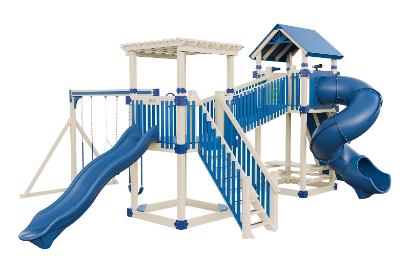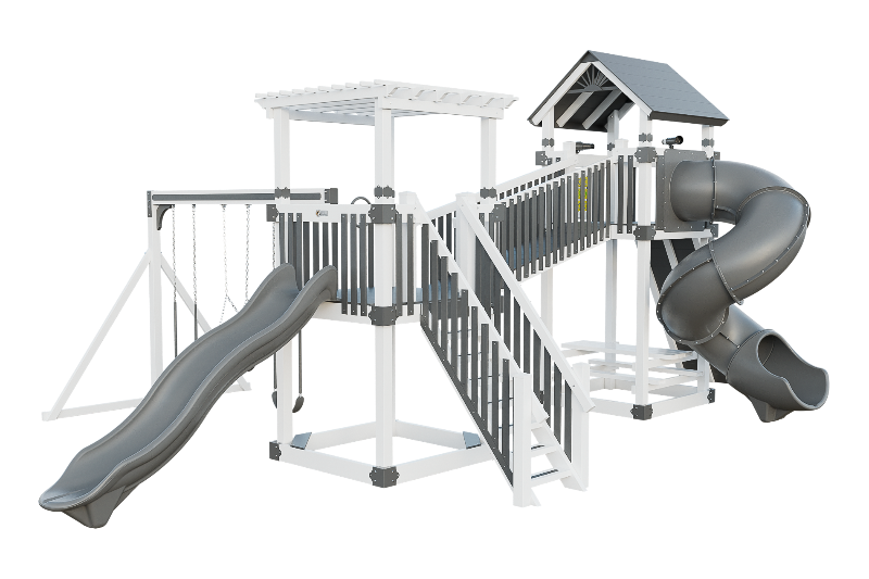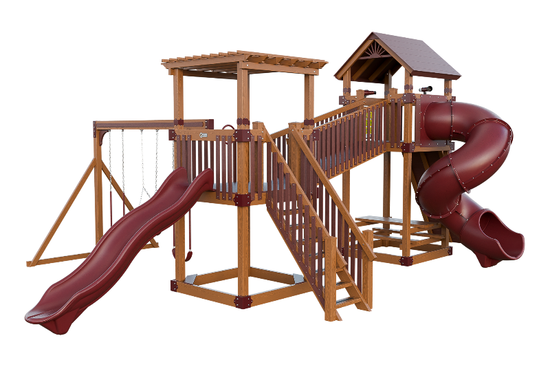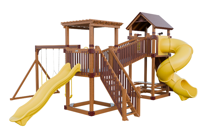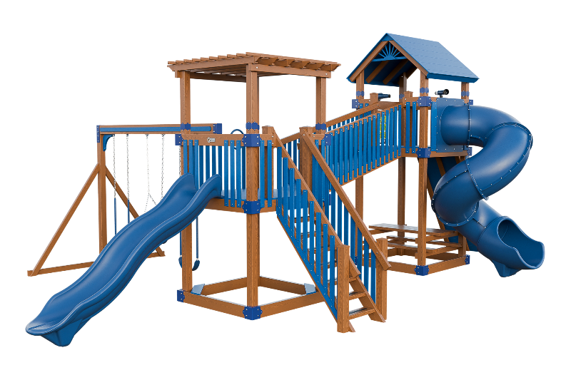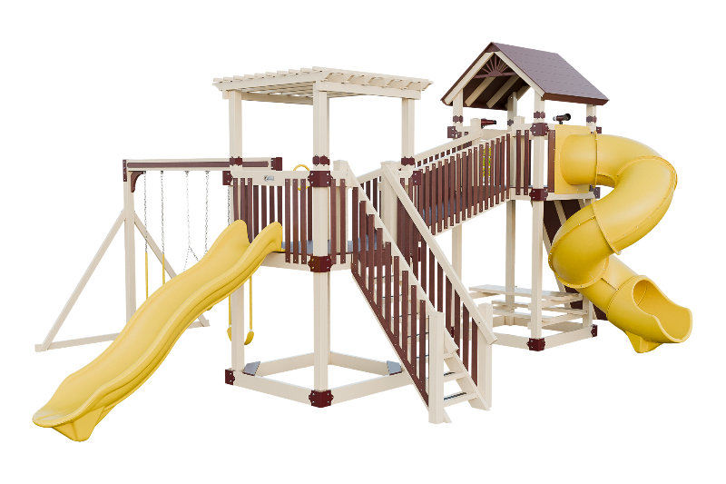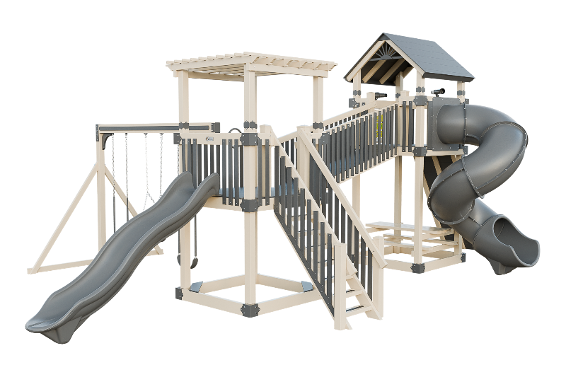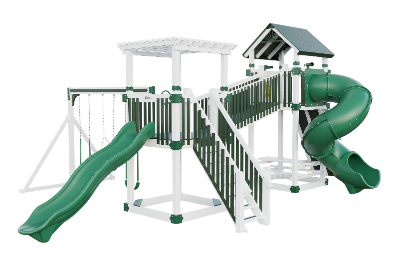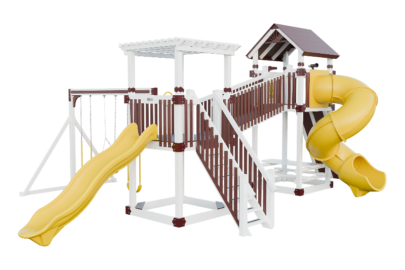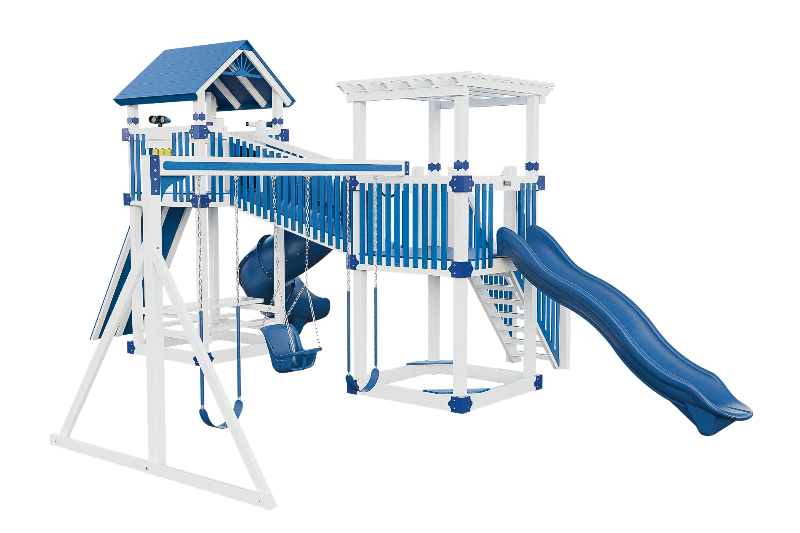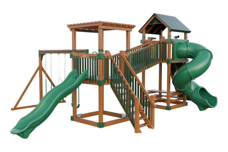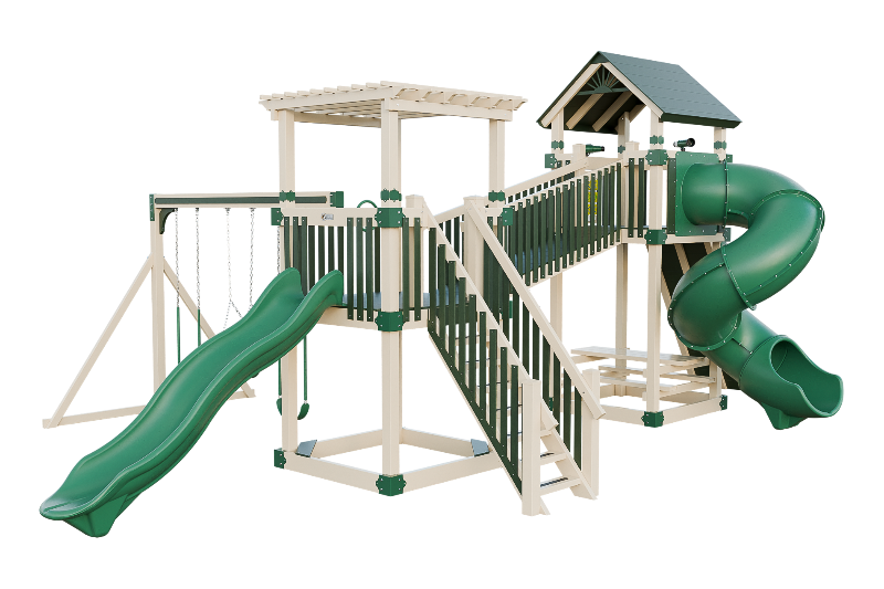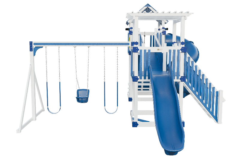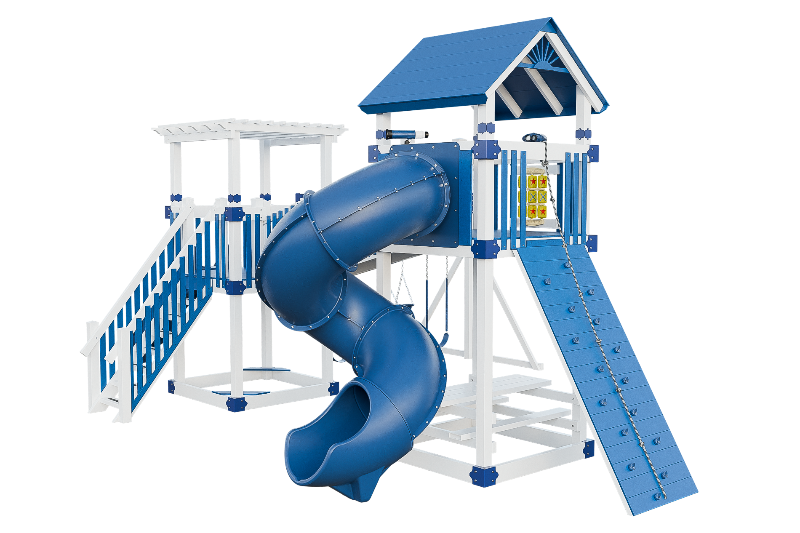 The Traverse playset offers a spacious and versatile play area for children of different ages and abilities. It consists of two towers of different heights, connected by a ramp. The lower tower, which is 5ft tall, has a staircase leading up to the poly deck and pergola roof. From there, children can enjoy sliding down the 10ft Avalanche slide or crossing the ramp to the higher tower. The higher tower, which is 7ft tall, has a tic-tac-toe panel and other fun accessories like binoculars and telescope. Children can also slide down the 7ft Turbo twister or climb up the rock wall for more challenges. The playset also features a picnic table for snacks and breaks. A 3-position single swing beam allows for two belt swings and a baby swing or other options for swings.