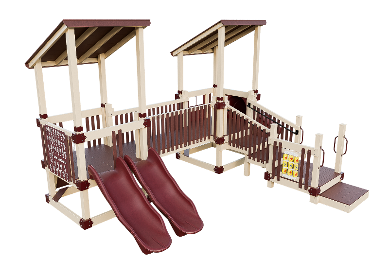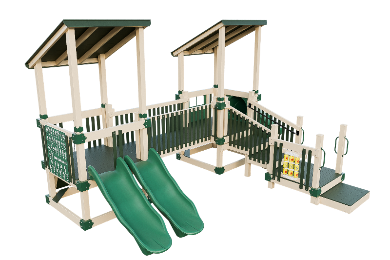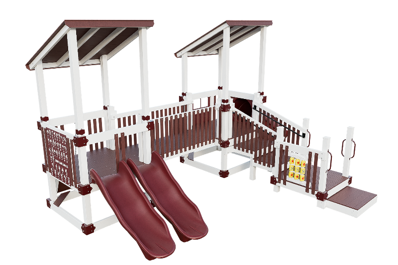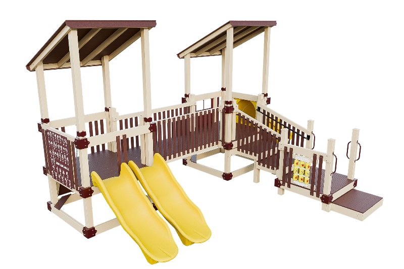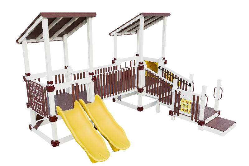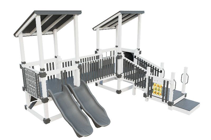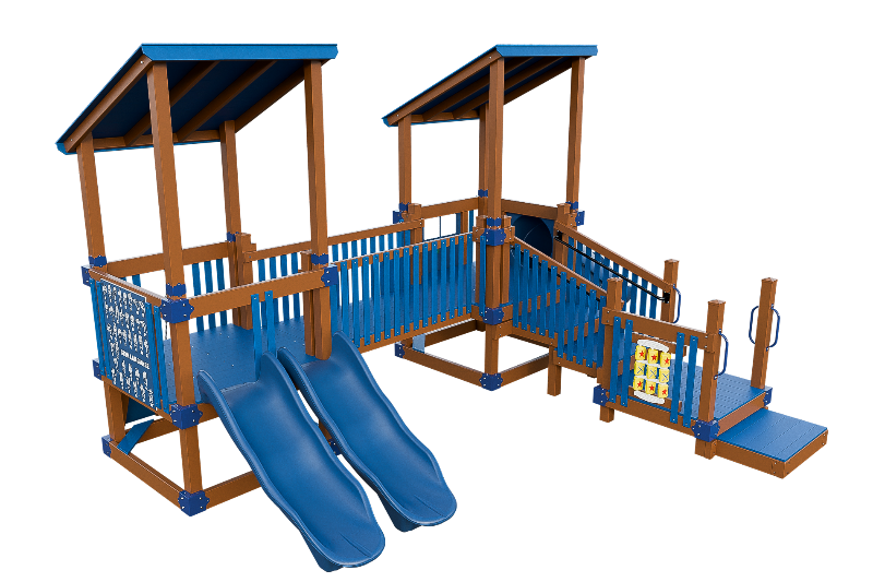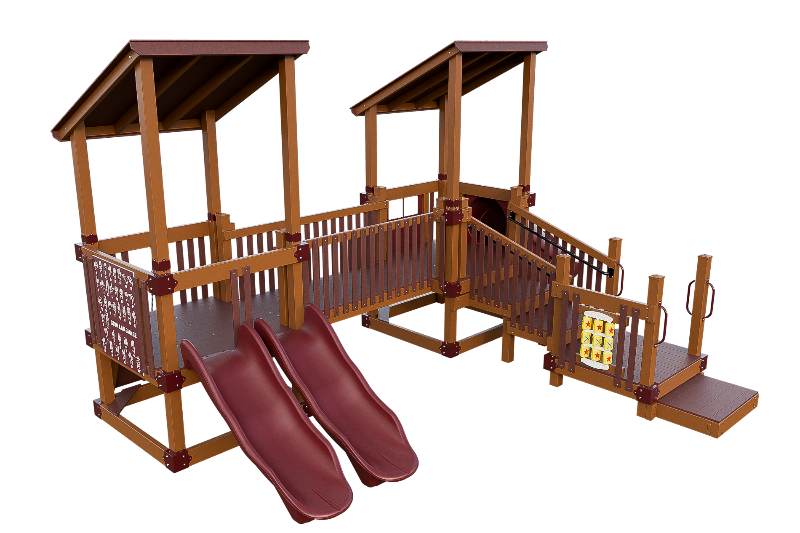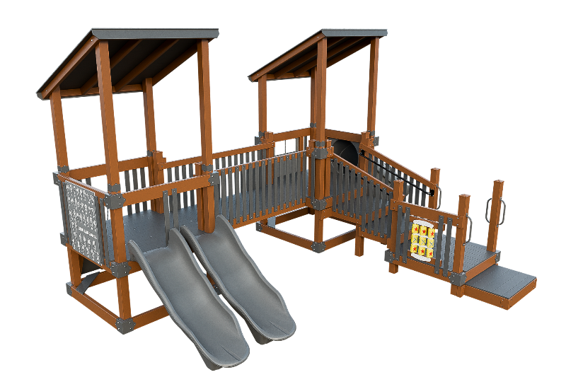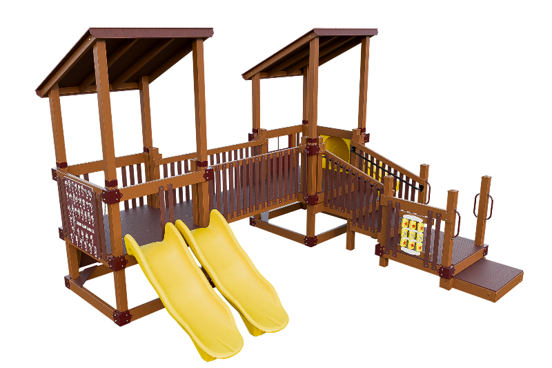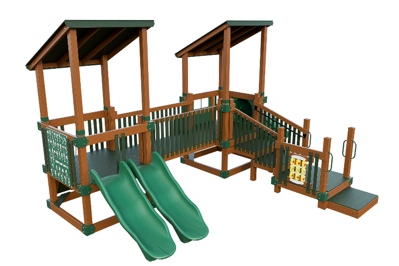 Bring the fun into this playset design. Our easy access ADA platform ensures inclusivity, providing access to all the wonders of imagination. Small children will delight in climbing the 3ft rock wall, gaining confidence as they ascend onto the 3ft high tower. There they can cross a bridge to another tower, offering ample space for exploration. The playset can be customized with an array of activity panels and features a double 6ft Avalanche slide and a 3ft tunnel express slide.