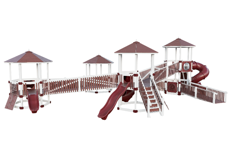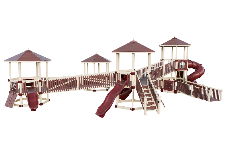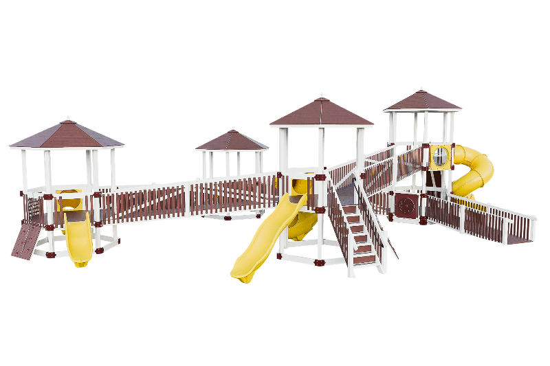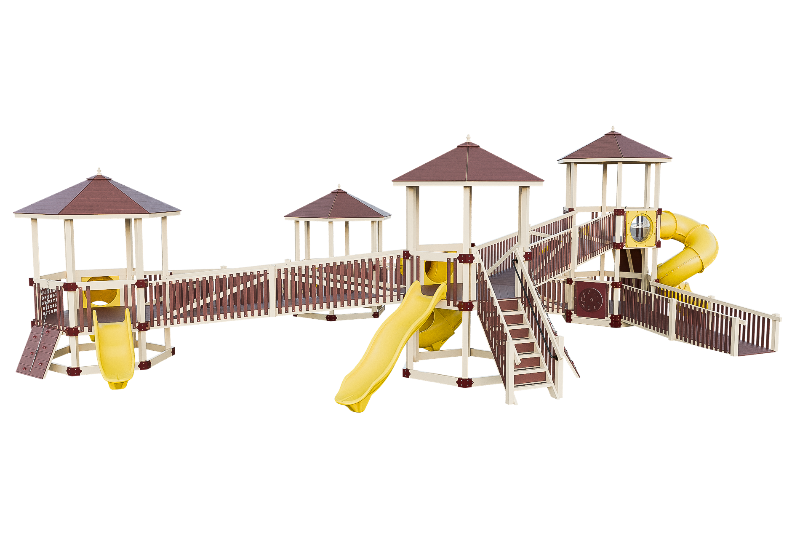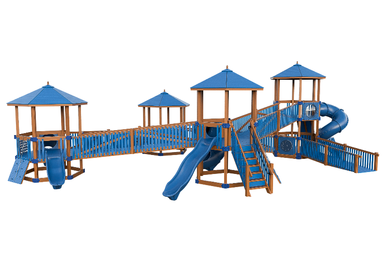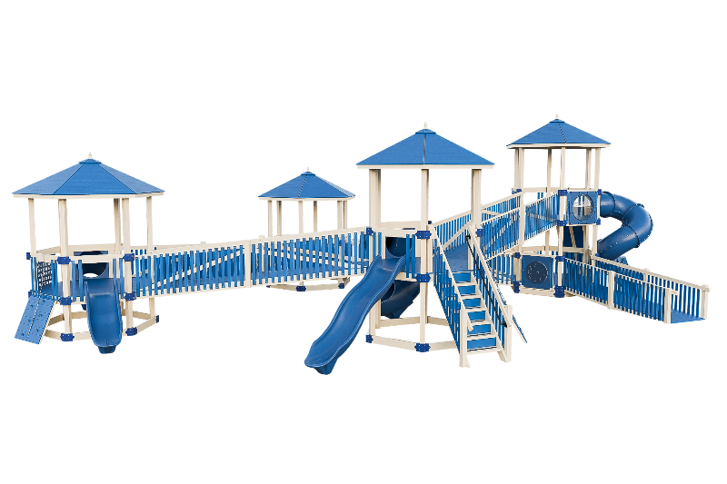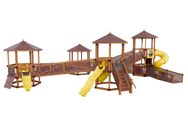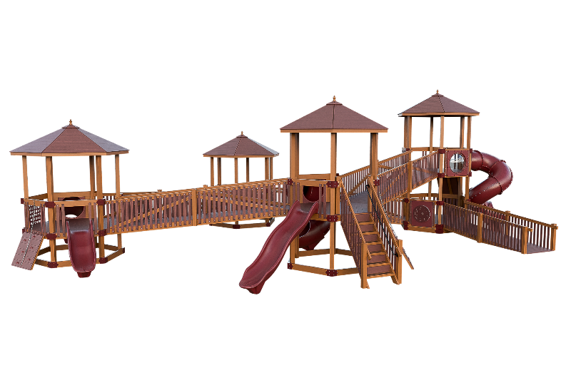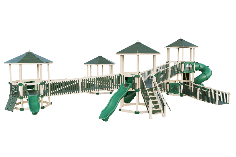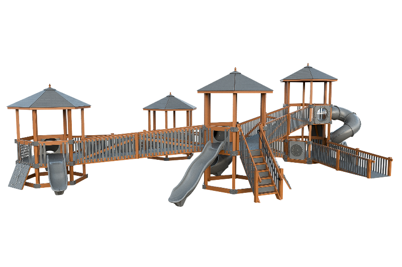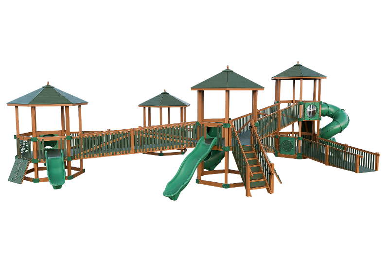 The Mighty Journey playset is designed to accommodate children of all abilities, including those who use wheelchairs. It features extra wide ramps and bridges that connect the hexagon towers, where kids can explore different activity panels that stimulate their learning. The playset is made of high-quality materials that prevent splintering and require minimal maintenance. Children can also enjoy the slides and rock walls that offer fun and challenge. The Mighty Journey playset is a great way to promote inclusion, diversity and accessibility in your playground.